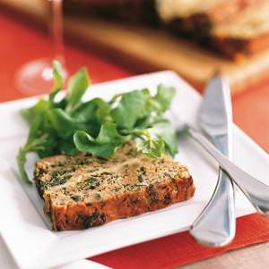 Разогрейте духовку до 180 °С. В миске перемешайте фарш, шпинат, лук, панировочные сухари, петрушку, орегано, яичные белки, соль и?перец. Половину фарша выложите ровным слоем в форму, посыпьте тертым сыром, а сверху распределите оставшийся фарш и смажьте смесью кетчупа и горчицы. Запекайте в течение 1 часа до образования румяной корочки. Дайте постоять 10 минут, затем разрежьте на 6?порций.