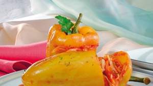 Очистите рыбу от кожи и костей. С яблок срежьте кожуру, удалите сердцевину. Лук, палтус и яблоки порубите мелкими кубиками и выложите в разогретую кастрюлю с оливковым маслом, добавив стакан белого вина и немного молока. Тушите смесь 10–12 минут. С перцев срежьте шляпки и осторожно вычистите семечки и перегородки. Рыбно-овощную массу выложите в перцы и запеките в духовке до готовности. Все ингредиенты для соуса взбейте в блендере. Подавайте перец с зеленью и соусом.