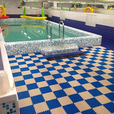 модульное покрытие для бассейна материал модулей из ПВХ устойчив к различным маслам, не вступает в химические реакции, негорючий и экологически чистый. С изнаночной стороны модули сделаны таким образом, что обеспечивается их прочное сцепление с любыми видами полов. Модульное покрытие для бассейна может быть выполнено в любом цвете — его с легкостью можно подобрать под интерьер любого бассейна или помещения.