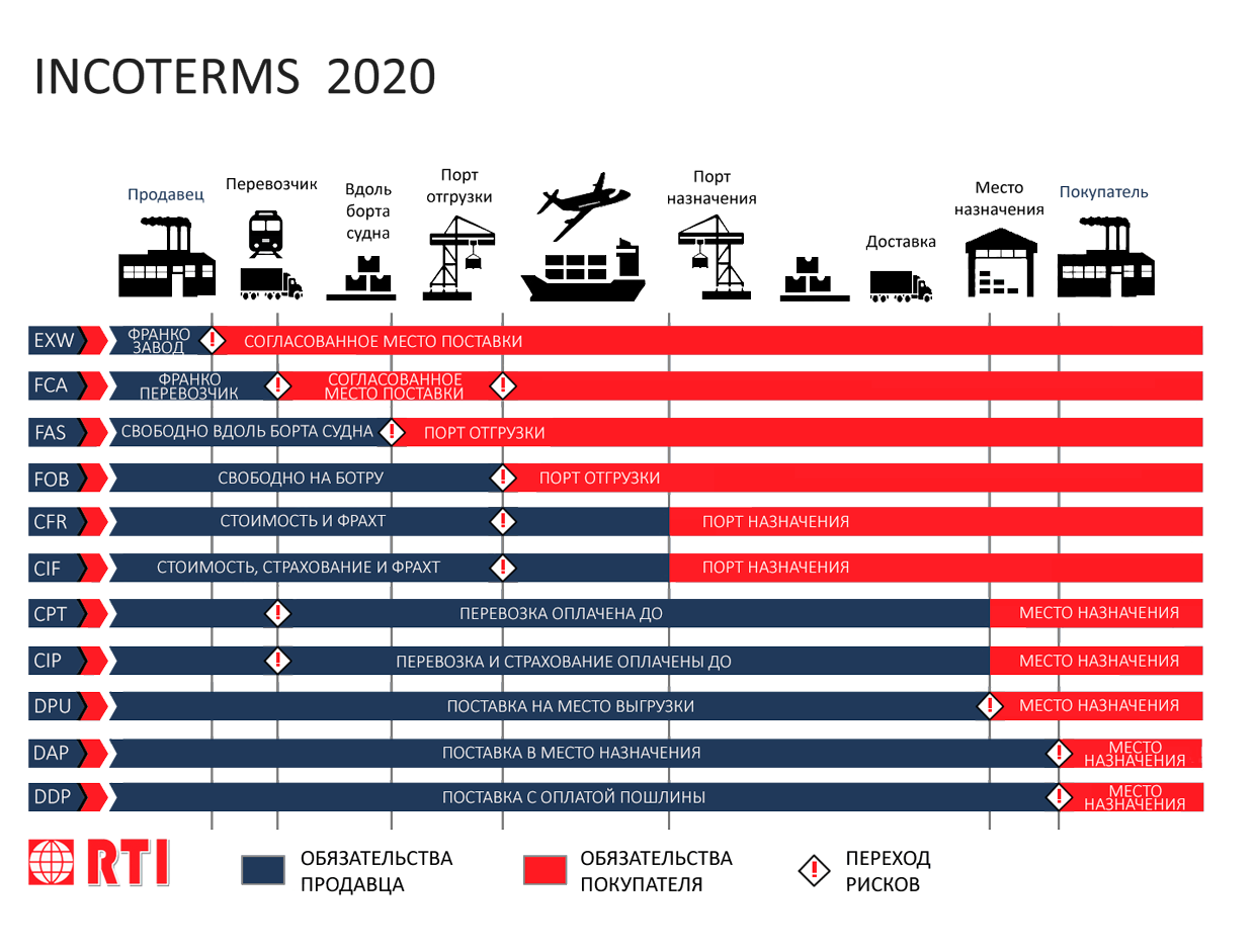Условия поставки FOB Инкотермс — «Free On Board» («Свободно на борту» указанный порт отгрузки) означает, что продавец выполнил поставку, когда товар перешел через поручни судна (на борт судна) в указанном порту отгрузки. Риск утраты или повреждения товара переходит от продавца, когда товар находится на борту судна, с этого момента покупатель несет все расходы. При размещении товара в контейнере типичным для продавца является передача товара перевозчику на терминале, а не путем размещения на борту судна, в таких случаях следует использовать термин FCA.
