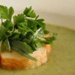 Этот аппетитный диетический супчик-пюре можно украсить лодочкой из кростини, посыпанным петрушкой, эстрагоном и зеленым луком.