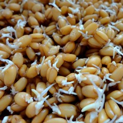 Как же прорастить пшеницу для диеты сыроедения? Необходимо взять 4 ст. ложки цельной пшеницы. Это количество зерен является суточной нормой для одного человека. Вечером, зерна пшеницы необходимо тщательного промыть и уложить одним слоем в плоскую емкость. Потом нужно залить пшеницу холодной сырой водой. Утром пшеницу промываем проточной водой и выкладываем на влажную ткань в плоское блюдо или тарелку. Сверху накрываем емкость влажной марлей и помещаем в теплое место. На протяжении дня желательно 2–3 раза промыть пшеницу. Пшеница со временем должна пустить белые ростки высотой не меньше 1 мм. Через некоторое время ее можно употреблять.