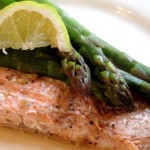 4. Положите по одному куску филе лосося в центр каждого куска фольги, сверху положите горсть спаржи и сбрызните лимонным соком.
